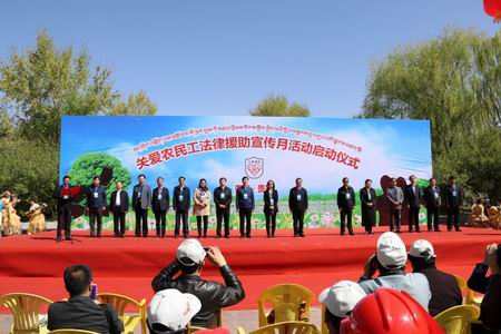 5月4日,由中共青海省委宣传部、青海省总工会、青海省团省委、青海省妇联、青海省司法厅、青海省人力资源和社会保障厅、青海省残联主办、海南州协办、贵德县承办的关爱农民工法律援助宣传月启动仪式在贵德县玉皇阁文化广场隆重举行。省委宣传部副部长申红兴、省司法厅厅长苏荣、省总工会副主席常伟宁、团省委副书记索朗德吉、省妇联副主席宝兰花、省残联副理事长白谊青、民盟青海省委专职副主委李居仁等领导莅临现场。副部长申红兴宣布关爱农民工法律援助宣传月活动启动,省司法厅副厅长刘伯林讲话,贵德县县长安木拉致辞,海南州副州长王永武主持。